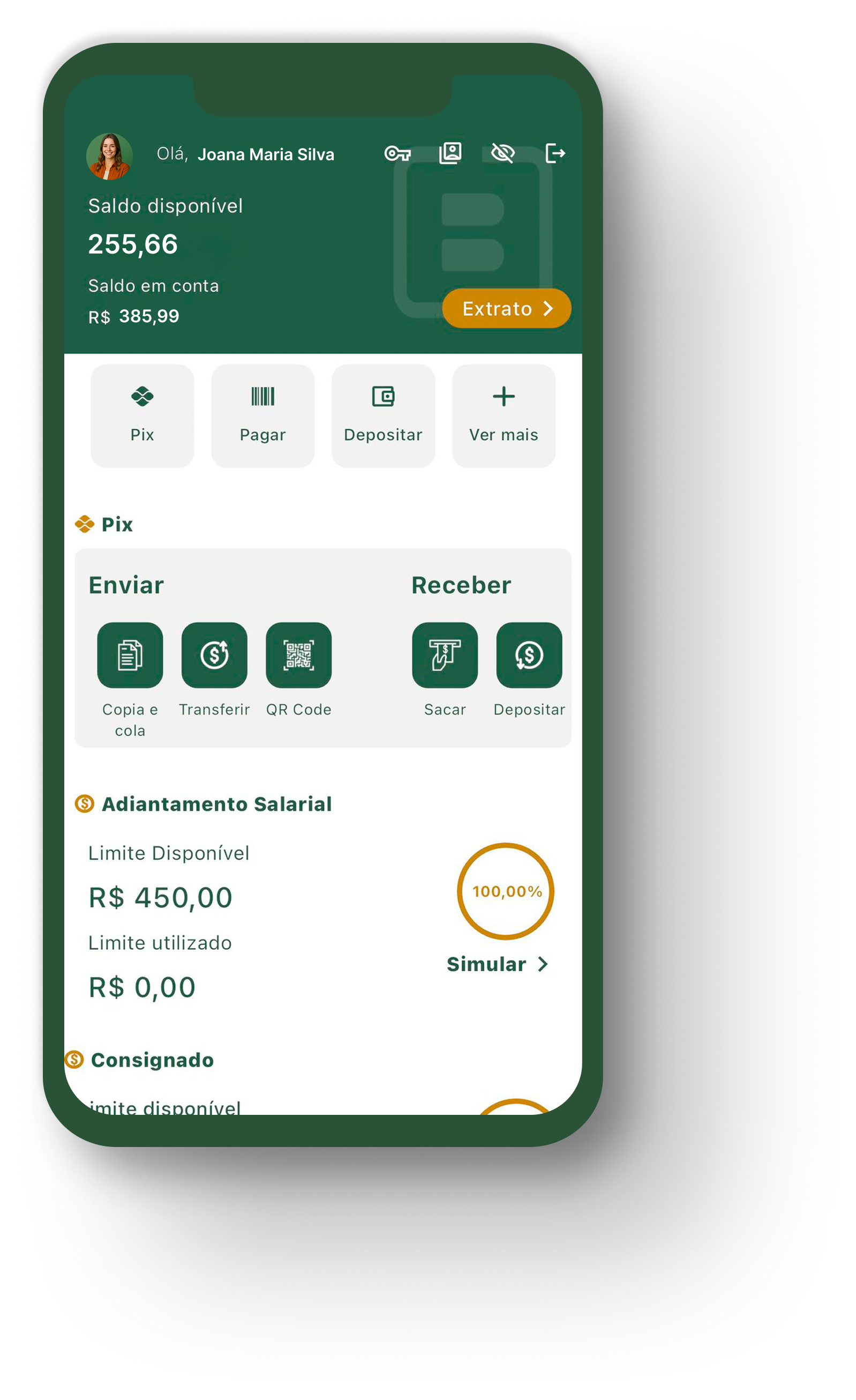 Com nossa tecnologia Plug and Play, a solução se integra facilmente à folha de pagamento da sua empresa, sem necessidade de adaptações complexas ou processos demorados. Você ativa com poucos cliques, e seus colaboradores já podem usar o crédito imediato na conta digital.